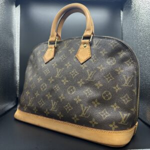 お写真のバッグは、ルイ・ヴィトンを代表するバッグの一つであり、その美しい曲線的なフォルムが特徴的な「アルマ」です。定番のモノグラム・キャンバスが使用されており、底面のヌメ革(カウハイドレザー)が経年によりアメ色に変化している様子が、長年大切に使われてきた歴史を感じさせます。