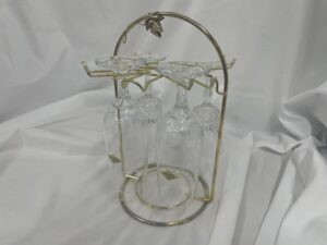 繊細なカットが施されたワイングラスとシャンパングラス、そして葡萄のモチーフが愛らしいゴールドカラーの専用スタンドをセットでお売りいただきました。