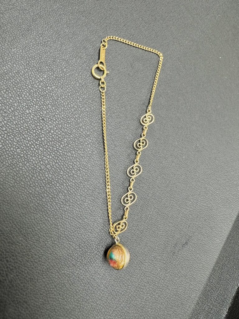 こちらのブレスレットは、シンプルなチェーンに加えて曲線的な装飾パーツが並んだ、個性的で目を引くデザインです。さらに、トップには色の入った小さなモチーフがついており、ゴールドの輝きにアクセントを加えています。