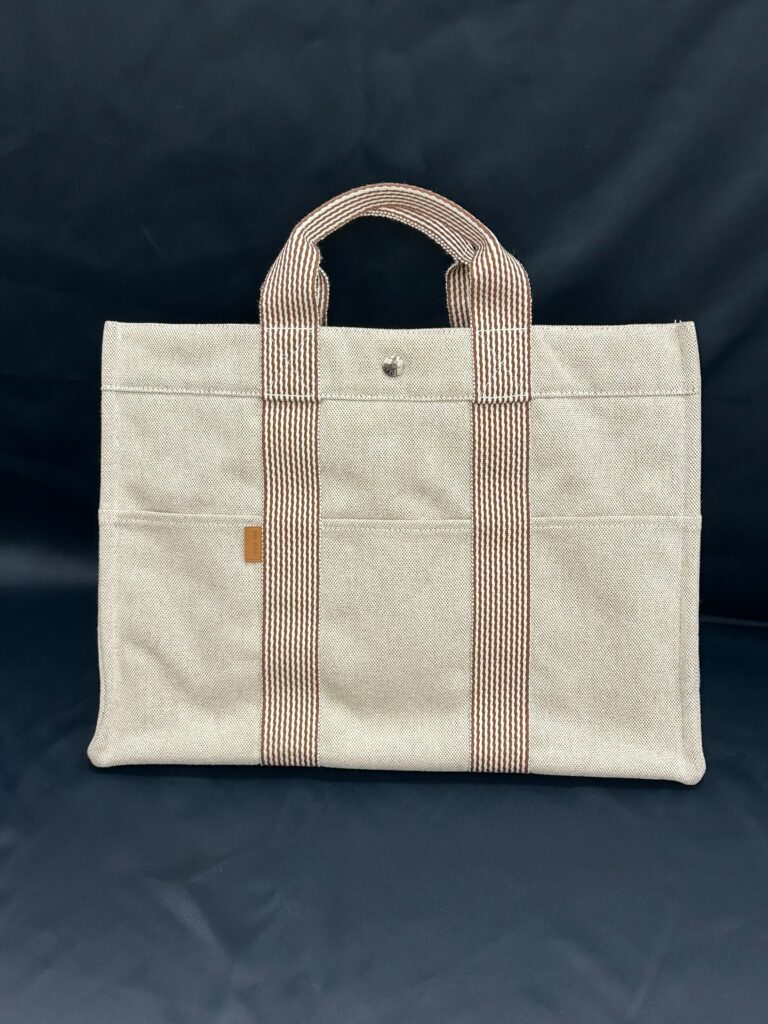 本日は、Hermès(エルメス)のキャンバストートをお買取りいたしました。上質なキャンバス素材に落ち着いたベージュカラー、そして特徴的なストライプのハンドルが組み合わさったシンプルかつ洗練されたデザインが魅力のバッグです。軽量で持ちやすく、日常使いからビジネスシーンまで幅広く活躍できるアイテムとして人気を集めています。
