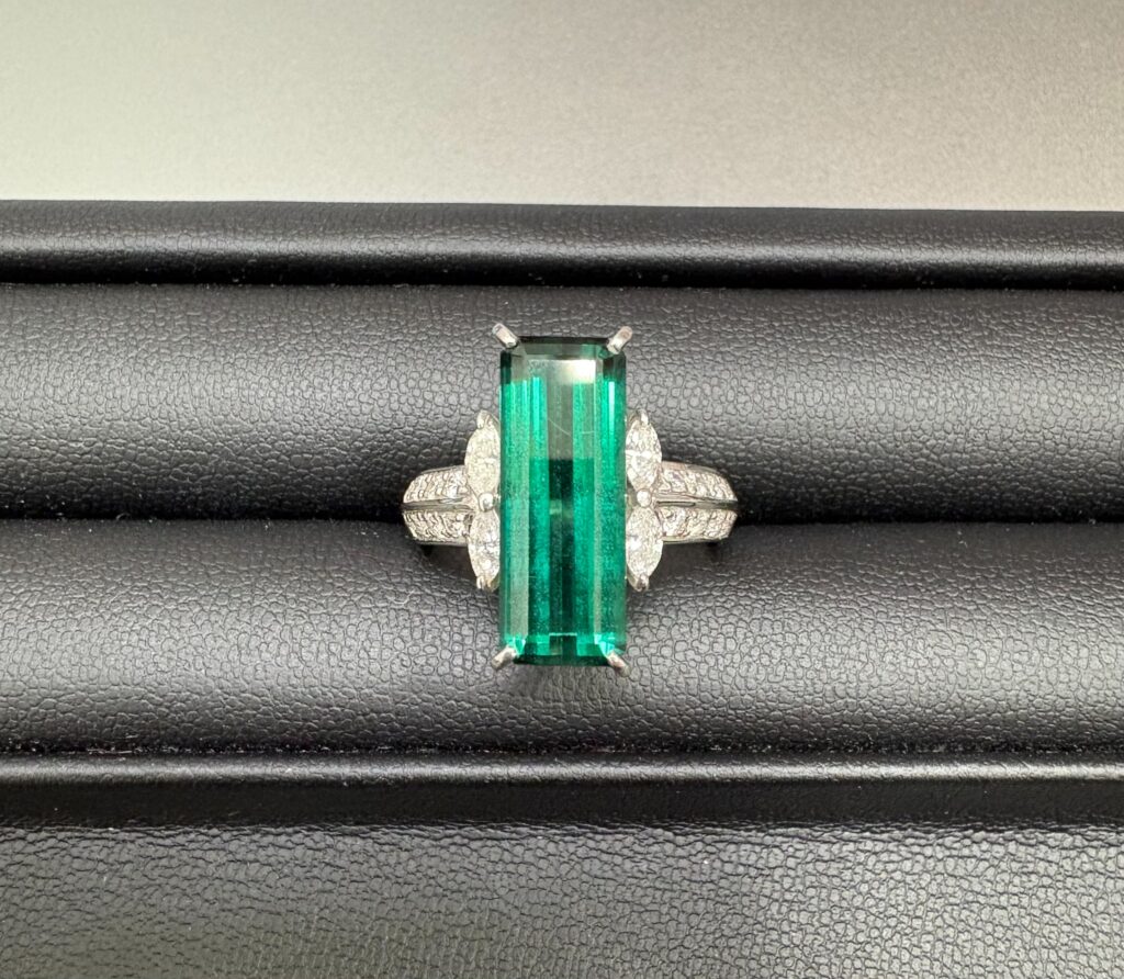 主役である大粒のエメラルドカット(スクエアカット)トルマリンの深く鮮やかなグリーンが、息をのむ美しさです。その両脇を飾るマーキス型やラウンド型の高品質なダイヤモンドが、主石の輝きを一層引き立てています。
