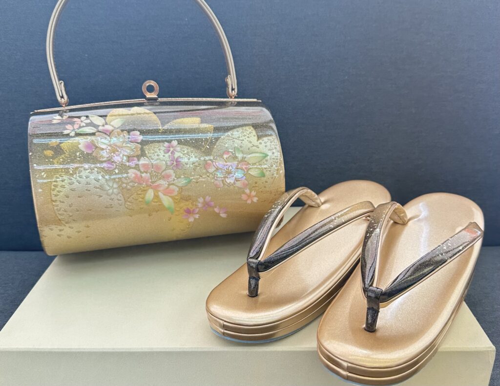 • 草履:バッグと同系色のゴールドで統一され、統一感のあるコーディネートが完成します。