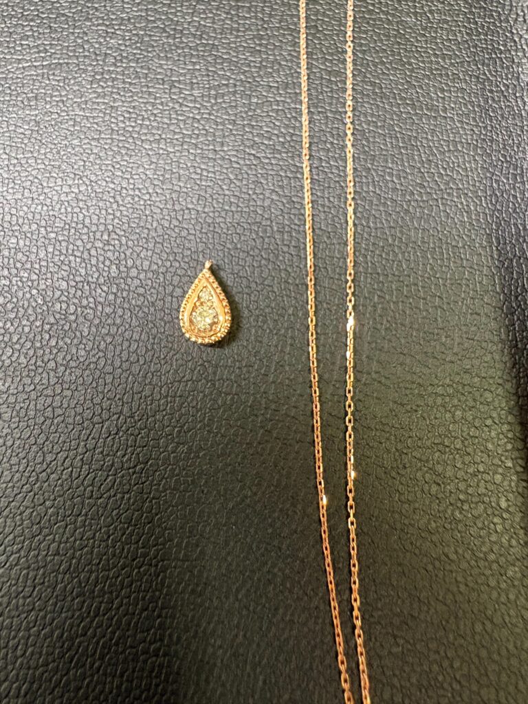 K18の土台に、高品質なメレダイヤモンドが贅沢に敷き詰められたドロップモチーフのネックレスです。普遍的なデザインでありながら、ダイヤモンドの強い輝きが、胸元を非常に華やかに彩ってくれます。