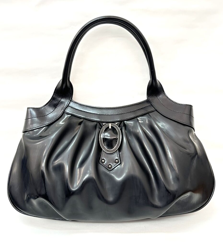 深い光沢を放つブラックのエナメルレザーに、洗練されたデザインが光る、非常にエレガントなバッグです。日本の職人技が光るきめ細やかな作りと、流行に左右されない上品なフォルムが魅力ですね。