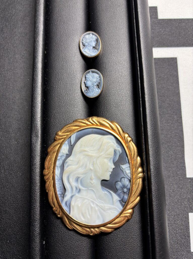 カメオの素材には主に、貝殻(シェルカメオ)や天然石(ストーンカメオ)があります。天然石に女性の横顔が丁寧に彫られた、まるで小さな美術品のような逸品です💎
