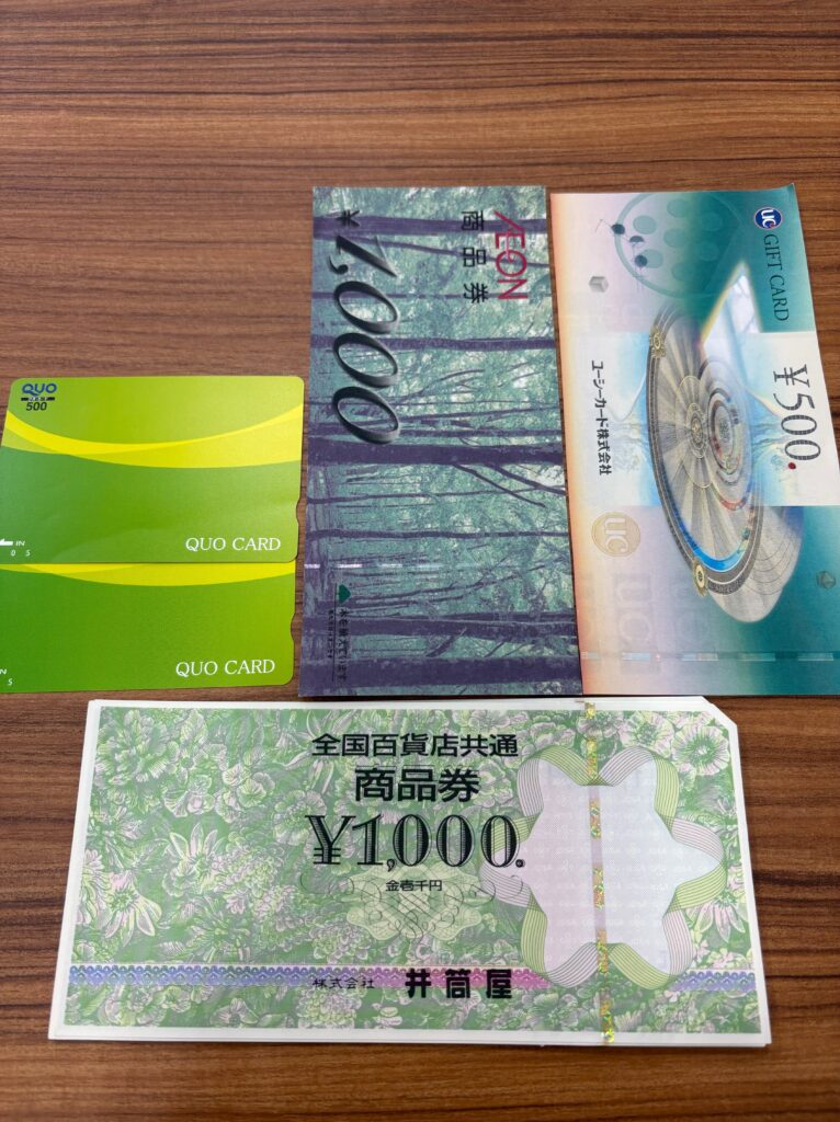 本日、ご自宅に眠っていたQUOカード、全国百貨店共通商品券、イオン商品券、UCギフトカードなど、各種金券・ギフトカードをまとめてお買取りさせていただきました!