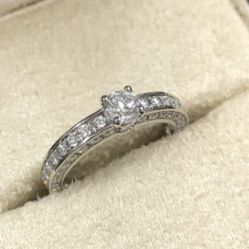 センターダイヤモンドの輝きと、アームに敷き詰められたメレダイヤの上品な煌めきが美しい一本💍