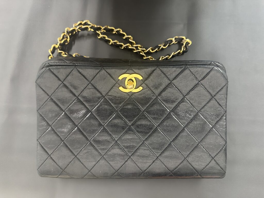 今回お買取りしたバッグは、シックなブラックレザーに、華やかなゴールドのチェーンストラップと、一目でシャネルとわかるココマークが輝いています。ラムスキン特有の柔らかな風合いと、長年大切に使われてきたことによるヴィンテージの風格が、新たな持ち主様へと受け継がれる価値を高めています。