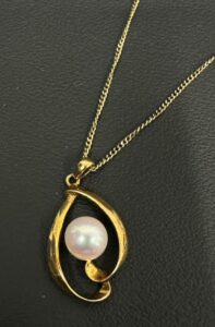 お持ち込みいただいたのは、温かみのあるゴールドのチェーンに、優美な曲線を描くデザインのトップが配されたネックレスです。トップの中央には、美しい光沢を放つ真珠(パール)が優しく包み込まれるようにセットされており、非常に上品で女性らしい逸品でした。真珠の輝きと18 金ならではの豊かなゴールドの光沢が素敵なジュエリーで、長年大切に使われていたことが伺えました。この度はお譲りいただき、誠にありがとうございました。