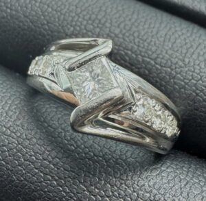 お持ち込みいただいたのは、プラチナの優美なラインが特徴的なデザイン性の高いリングです。メインにはプリンセスカットのダイヤモンドがセットされ、サイドにもメレダイヤが連なる、非常に豪華でエレガントな逸品でした!
