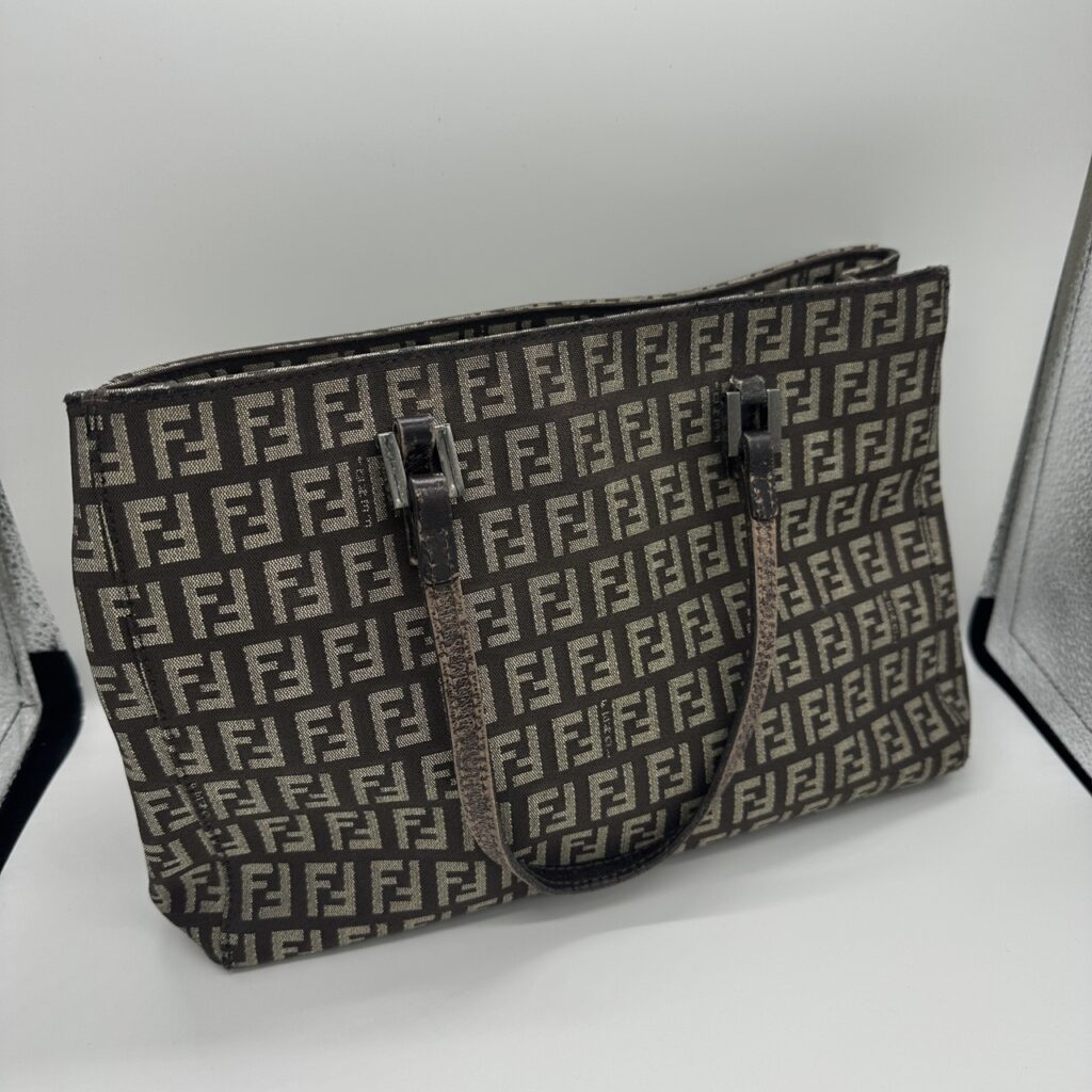お写真のバッグは、フェンディの代名詞とも言える「FFロゴ」が全面に織り込まれたズッカ柄(ズッキーノ柄)のデザインです。