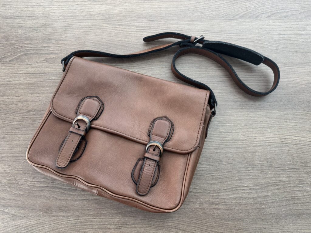 お持ち込みいただいたのは、肉厚な上質レザーに、レトロな雰囲気のベルト金具が特徴的なショルダーバッグです。オイルを含んだバロンシリーズのレザーは、使い込むほどに色艶が増し、唯一無二の経年変化(エイジング)を楽しめるのが最大の魅力です。