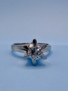 このリングは、センターのダイヤモンドを星のようなユニークな6本の爪で留めた、モダンで洗練されたデザインが特徴です。このようなデザイン性の高いジュエリーは、素材の価値だけでなく、製品としての価値も最大限に評価し、高価買取に繋げます!