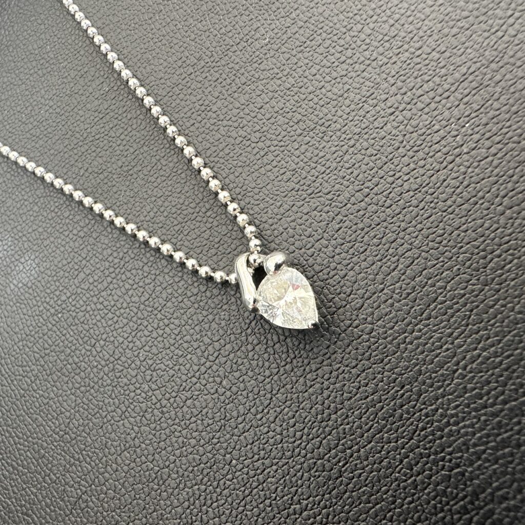 お写真のネックレスは、繊細なボールチェーンに、ティアドロップ型(ペアシェイプ)のダイヤモンドをあしらったペンダントトップが魅力的なジュエリーです。シンプルながらも存在感があり、首元を美しく飾ります。