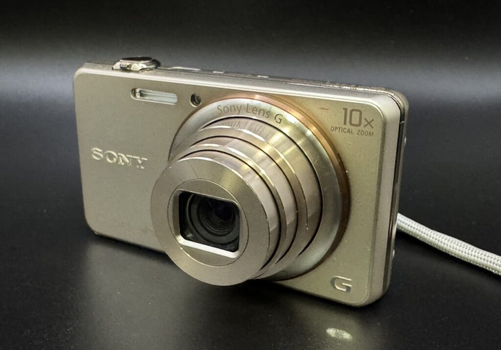 お持ち込みいただいたのは、ゴールドカラーのボディに「10×OPTICAL ZOOM」の文字が光る、コンパクトながらも高性能なカメラです。モデル名はDSC-WX200。18.2メガピクセルやWi-Fi、HD動画撮影機能など、当時の最新技術が詰まったスタイリッシュなモデルです。