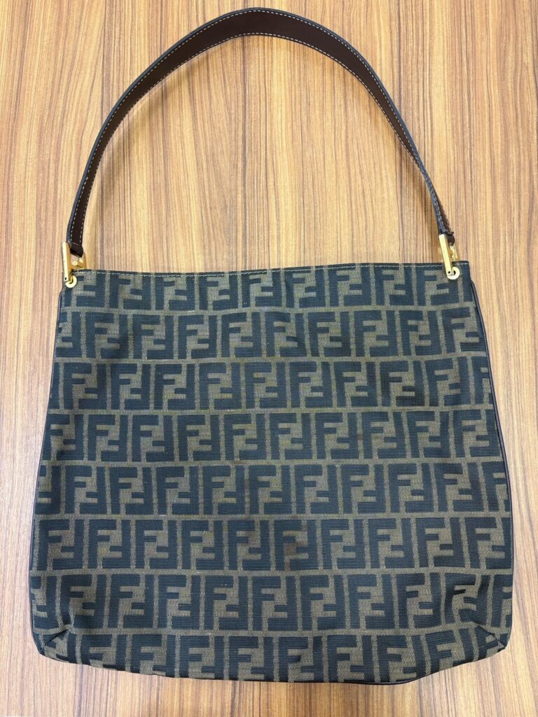 お持ち込みいただいたのは、フェンディの象徴的なデザインであるズッカ柄(FFロゴ)のショルダーバッグです。ダークブラウンとブラックのシックな組み合わせが時代を超えて愛される、非常に人気の高いお品物です✨