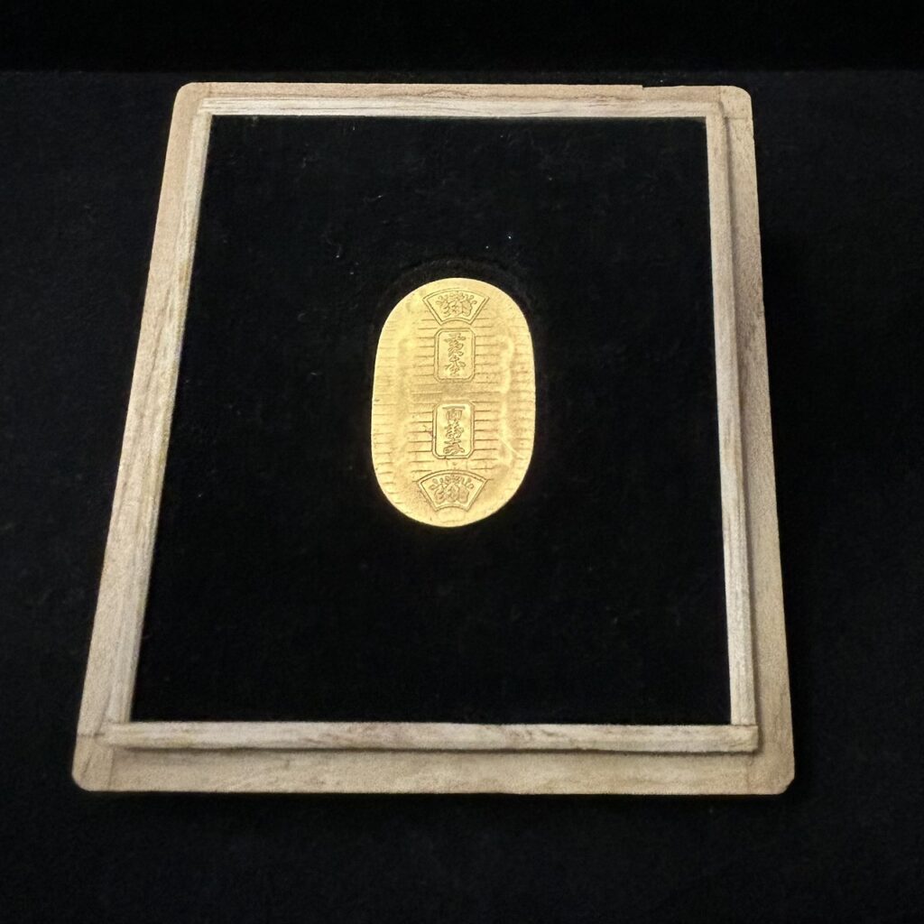写真をご覧ください。桐箱のような額縁に収められた小判は、その黄金の輝きが非常に印象的です。
