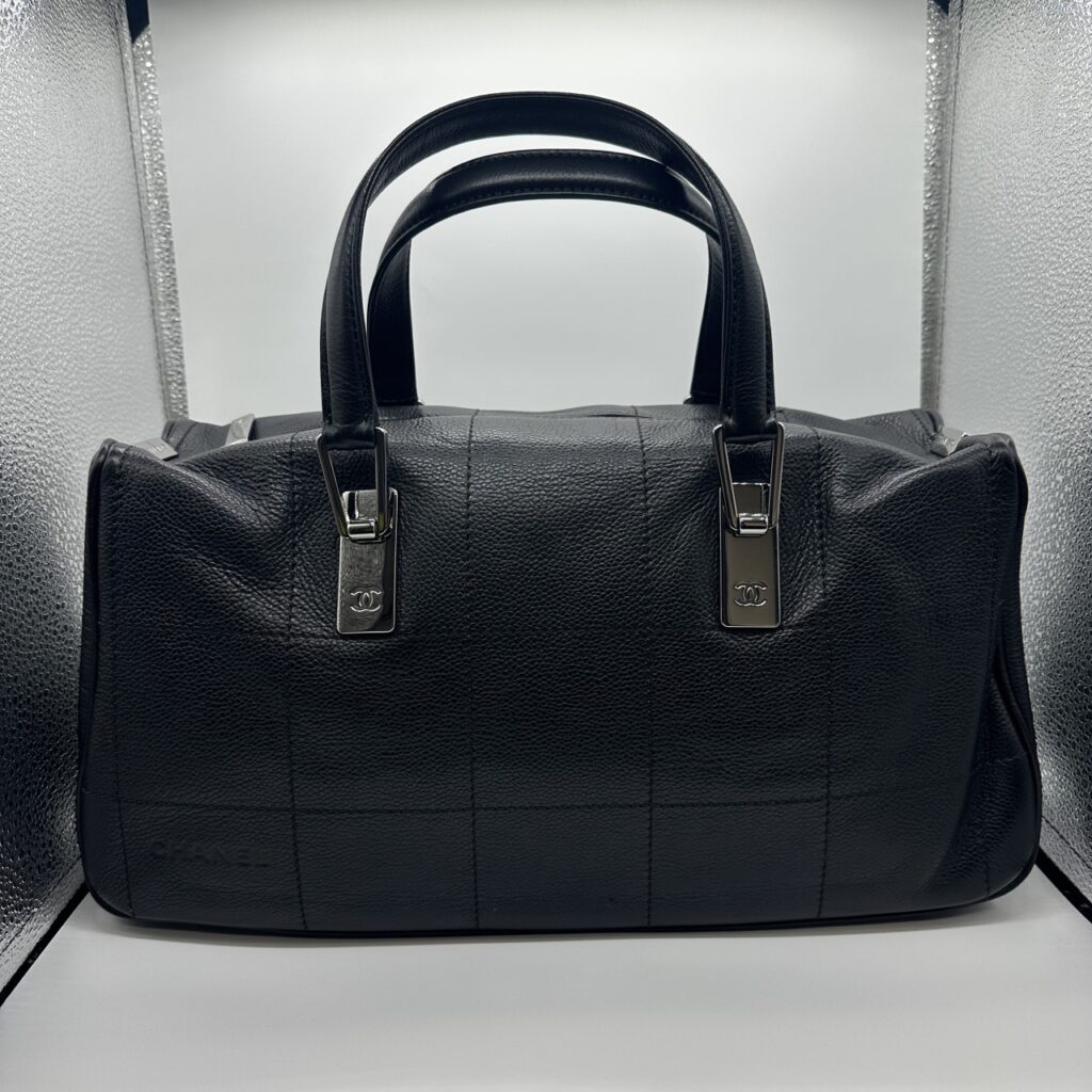 お写真の通り、上質なブラックレザーにスクエア型のステッチが施された、非常にスタイリッシュなデザインのバッグです。ハンドル部分の根元には、シャネルの象徴である「ココマーク」が刻印されたシルバーカラーの金具があしらわれており、さりげない高級感が漂います。
