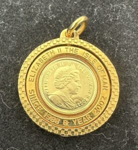 今回お持ち込みいただいたのは、純金製のマン島キャットコインを使用したペンダントトップです。コイン本体はK24、周囲の枠部分も金素材で構成されており、素材価値を含めた総合査定を行いました。