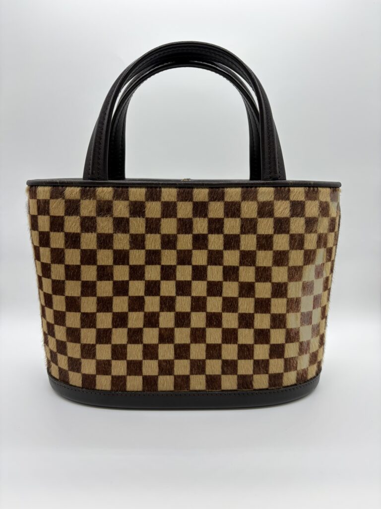 お写真をご覧の通り、ハラコ(ポニーヘア)素材にルイ・ヴィトンの象徴であるダミエ柄が施された、非常に高級感のあるお品物です。毛並みの艶やかさと、ブラウンのグラデーションが織りなす市松模様が、秋冬の装いを一層華やかに演出してくれます。