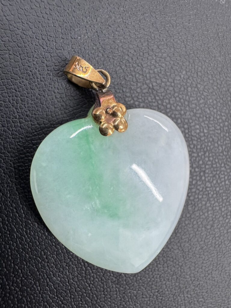やさしい淡緑色と乳白色が美しく調和した、ハート型に磨かれた翡翠(ヒスイ)のペンダントトップです。