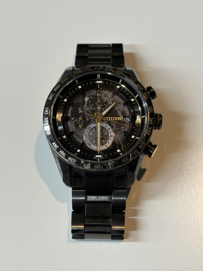 ケースやブレスレットには、シチズン独自の表面硬化技術が施されたブラックのチタニウムが使用されており、精悍で引き締まった印象を与えます。多針モデルとしての機能美と、月面探査という壮大なストーリーが融合した、まさに大人のためのコレクターズアイテムです。