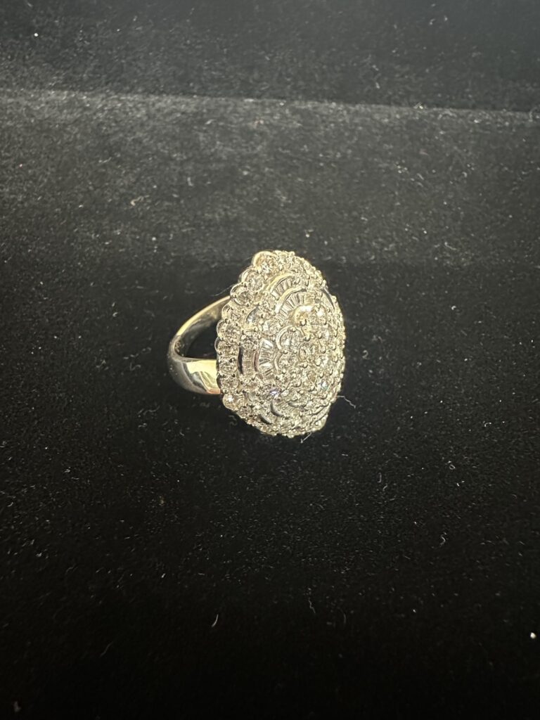 お写真をご覧ください。中央から外側へ向かって、ラウンドブリリアントカットやバゲットカットなど、異なる輝きを持つダイヤモンドが緻密に、そして立体的にセッティングされています。指元を覆うほどのボリューム感がありながら、計算されたデザインによって非常に気品あふれる仕上がりになっていますね。