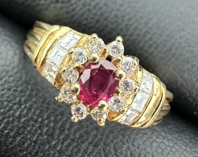 中央に鮮やかな赤色のルビーを配し、その周囲をダイヤモンドで取り巻いた華やかなデザインのリングです。ボリューム感のある造りで、ジュエリーとしての存在感がしっかりと感じられるお品物でした。