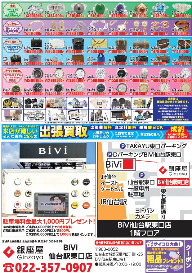 銀座屋BiVi仙台駅東口店では皆さまに喜んでいただけるお取引を心掛けておりますので、安心してご相談くださいませ。