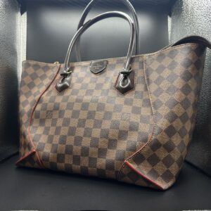 お写真のバッグは、ルイ・ヴィトンの定番であるダミエ・エベヌ・キャンバスに、レザーのトリミングと鮮やかな内装がアクセントになった、エレガントなトートバッグです。A4サイズも収納可能で、ビジネスシーンから日常使いまで幅広く活躍する人気のモデルです。