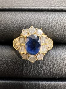 深いブルーが美しいサファイアを中心に、周囲にはきらめくダイヤモンドがあしらわれた、非常に上品で存在感のあるジュエリーでした。