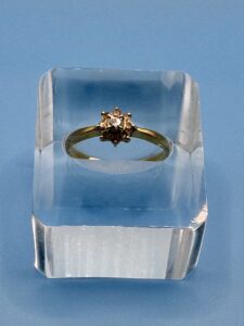 ・デザインの魅力: 小さな一粒ダイヤを、周囲の地金が星形や花びらのように囲むクラスターセッティングが施されています。このヴィンテージ調の細工は、石を大きく見せる効果もあり、デザイン性も高く評価いたしました。