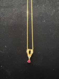 今回お持ち込みいただいたのは、鮮やかな赤色が目を引くルビーがあしらわれた、K18(18金)素材のペンダントネックレスでございます。